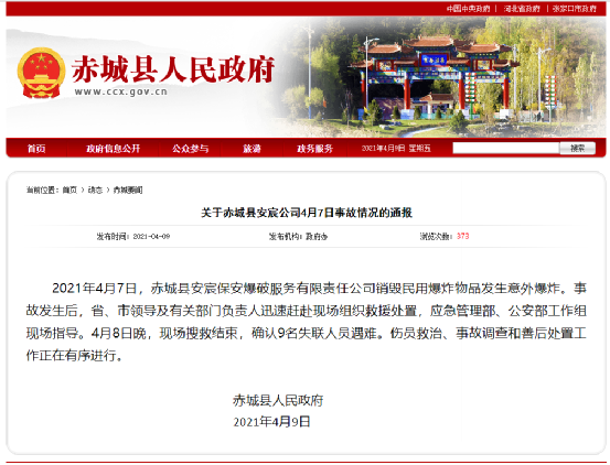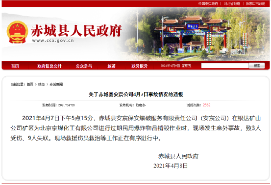 4月9日,河北张家口赤城县人民政府发布通报,2021年4月7日,赤城县安宸保安爆破服务有限责任公司销毁民用爆炸物品发生意外爆炸。事故发生后,省、市领导及有关部门负责人迅速赶赴现场组织救援处置,应急管理部、公安部工作组现场指导。4月8日晚,现场搜救结束,确认9名失联人员遇难。伤员救治、事故调查和善后处置工作正在有序进行。