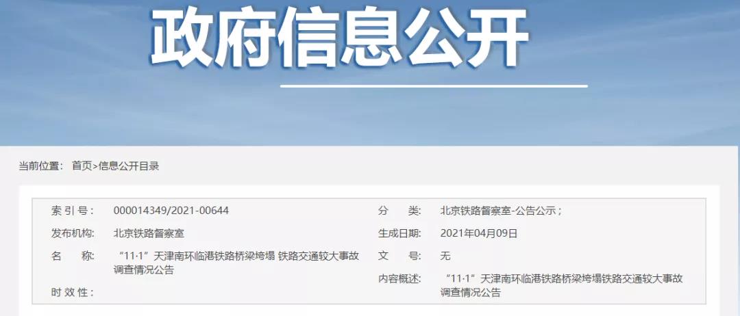 2021年4月9日,国家铁路局发布“11·1”天津南环临港铁路桥梁垮塌铁路交通较大事故调查情况公告。