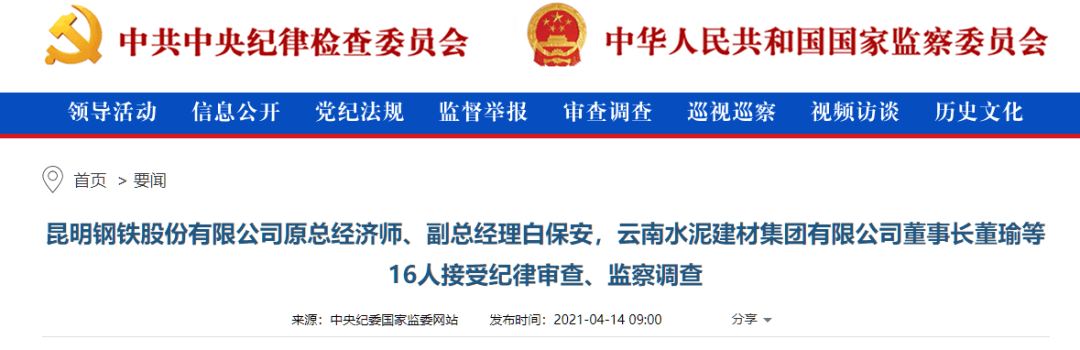 4月14日中央纪委国家监委网站发布要闻消息:昆钢党委书记、董事长、云南水泥建材集团有限公司董事长董瑜等多人接受审查调查。详情如下: