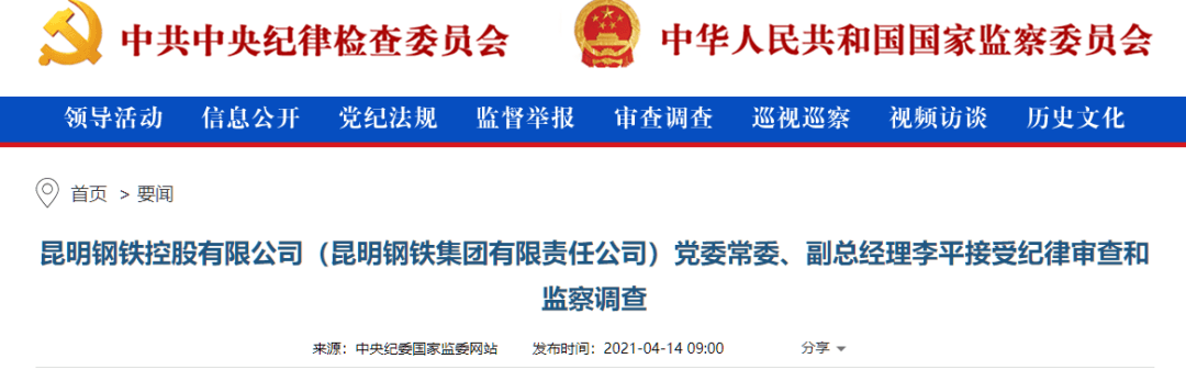 中央纪委国家监委网站讯 据云南省纪委监委消息:昆明钢铁控股有限公司(昆明钢铁集团有限责任公司)党委常委、副总经理李平涉嫌严重违纪违法,已主动投案,目前正在接受纪律审查和监察调查。