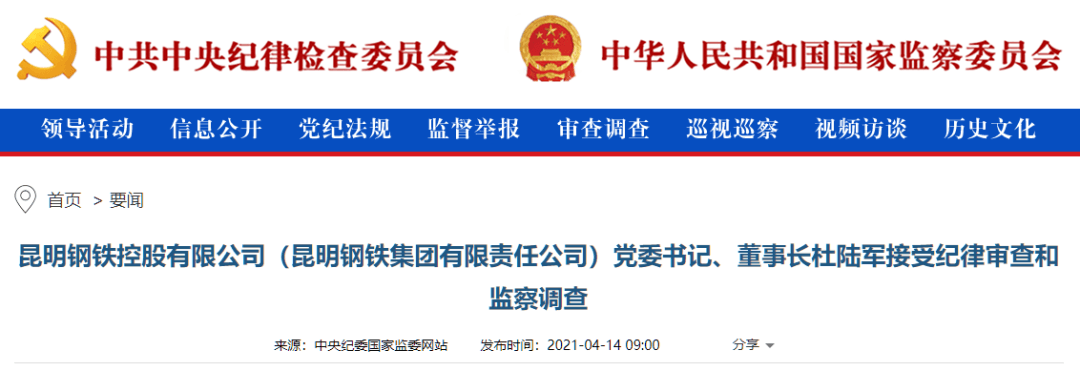 中央纪委国家监委网站讯 据云南省纪委监委消息:昆明钢铁控股有限公司(昆明钢铁集团有限责任公司)党委书记、董事长杜陆军涉嫌严重违纪违法,目前正在接受纪律审查和监察调查。