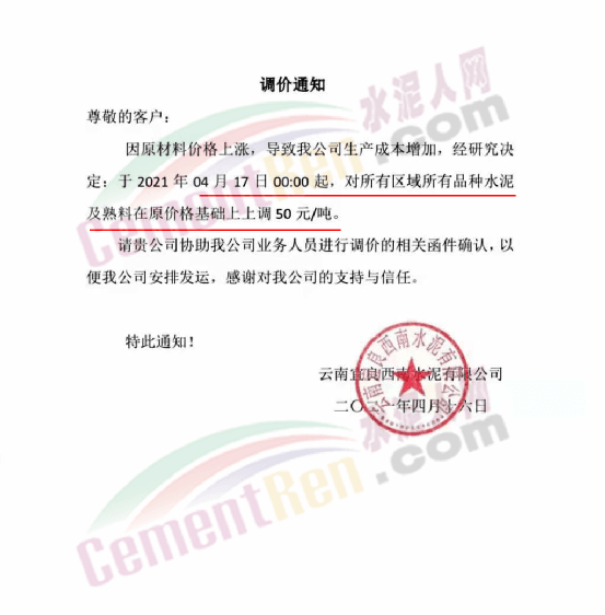 云南宜良西南水泥有限公司通知,自4月17日零点起,对所有区域水泥及熟料在原价基础上上调50元/吨。