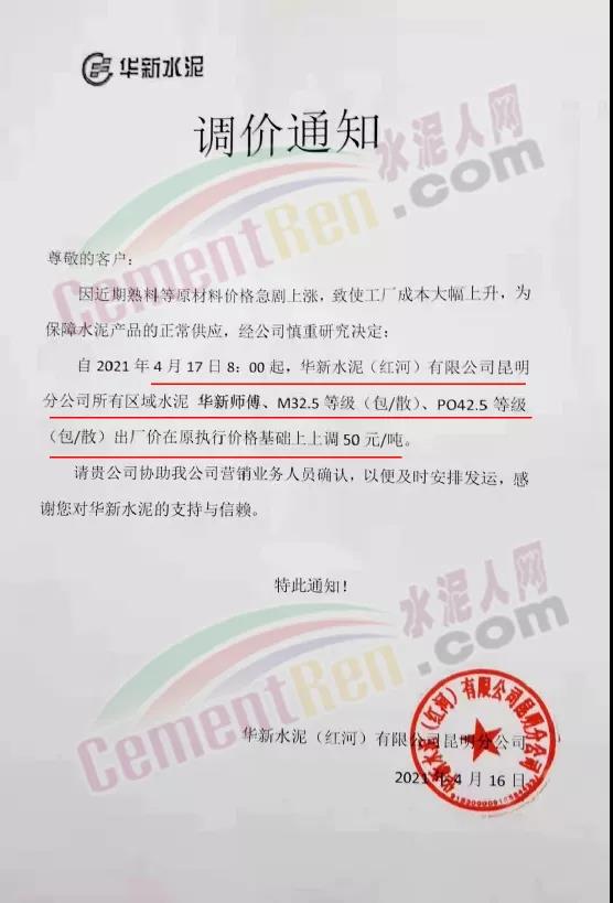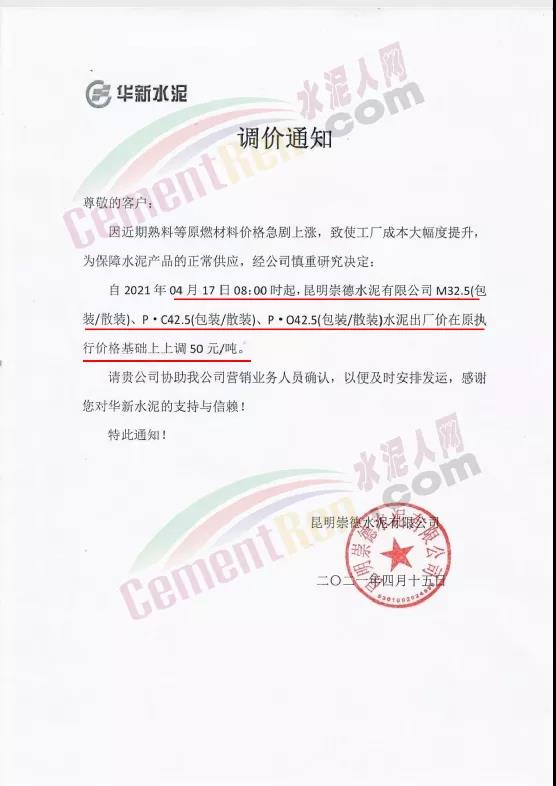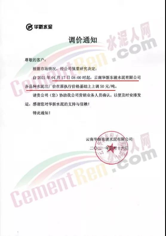 云南华新东骏水泥有限公司通知,自4月17日起各品种水泥出厂价在原执行价格基础上上调50元/吨。