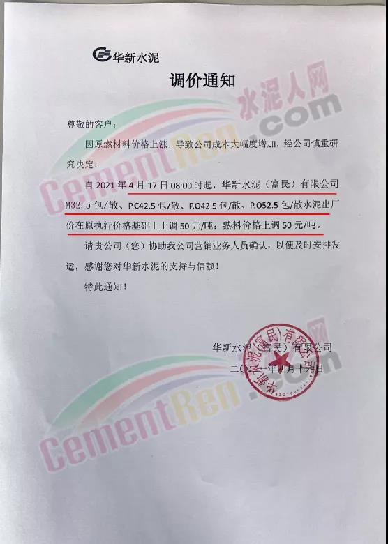 华新水泥(富民)有限公司通知,自4月17日8时起,M32.5包/散、PC42.5包/散、PO42.5包/散、PO52.5包/散水泥出厂价在原执行价格基础上上调50元/吨,熟料价格上调50元/吨。