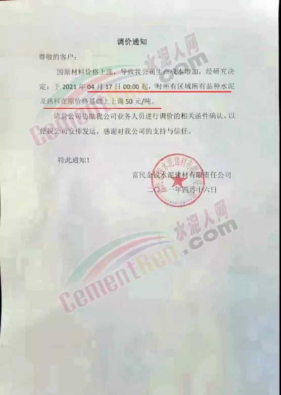 富民金锐水泥建材有限责任公司通知,因原材价格上涨,自4月17日0时起,对所有区域所有品牌水泥及熟料价格上调50元/吨。