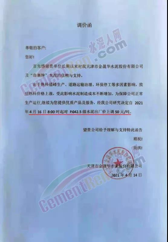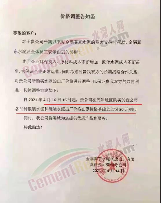 金隅冀东水泥(唐山)有限责任公司营销分公司通知,由于企业环保投入、原材料成本不断增加,致使水泥成本不断提高。自4月16日16时起,天津地区购买的各品种散装水泥和袋装水泥出厂价格在原价格基础上上调50元/吨。