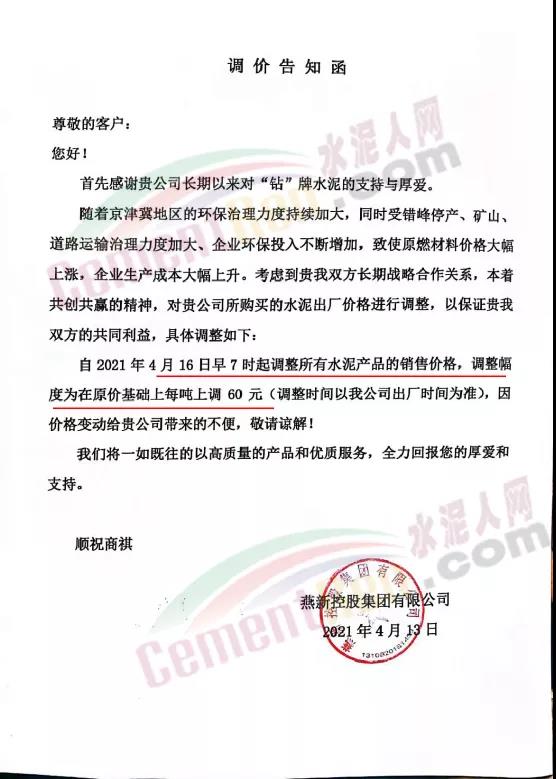燕新控股集团有限公司通知,随着京津冀地区的环保治理力度持续加大,同时受错峰停产、矿山、道路运输治理力度加大、企业环保投入不断增加,致使原燃材料价格大幅上涨,企业生产成本大幅上升。自4月16日早7时起公司所有水泥价格上调60元/吨。