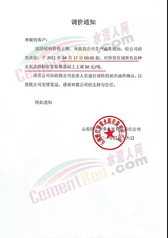云南澄江华荣水泥有限责任公司通知,因原材料价格上涨,导致公司生产成本增加,经公司研究决定自4月17日0时起,对所有区域所有品种水泥及熟料在原价格基础上上调50元/吨。