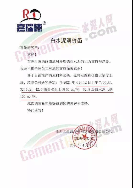 江西上高县中林白水泥有限责任公司通知自4月12日上午7时52.5级白水泥上调100元/吨。