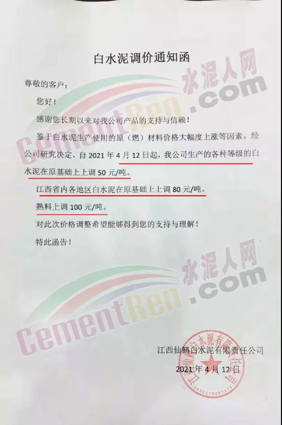 江西仙鹤白水泥有限责任公司通知,4月12日起,江西省内各地区白水泥在原基础上上调80元/吨,熟料上调100元/吨。