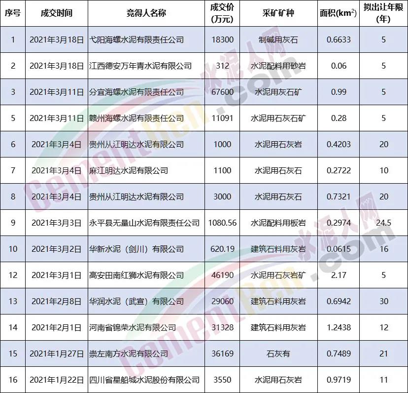 全国水泥行业矿山普查探矿权岀让成交结果统计
