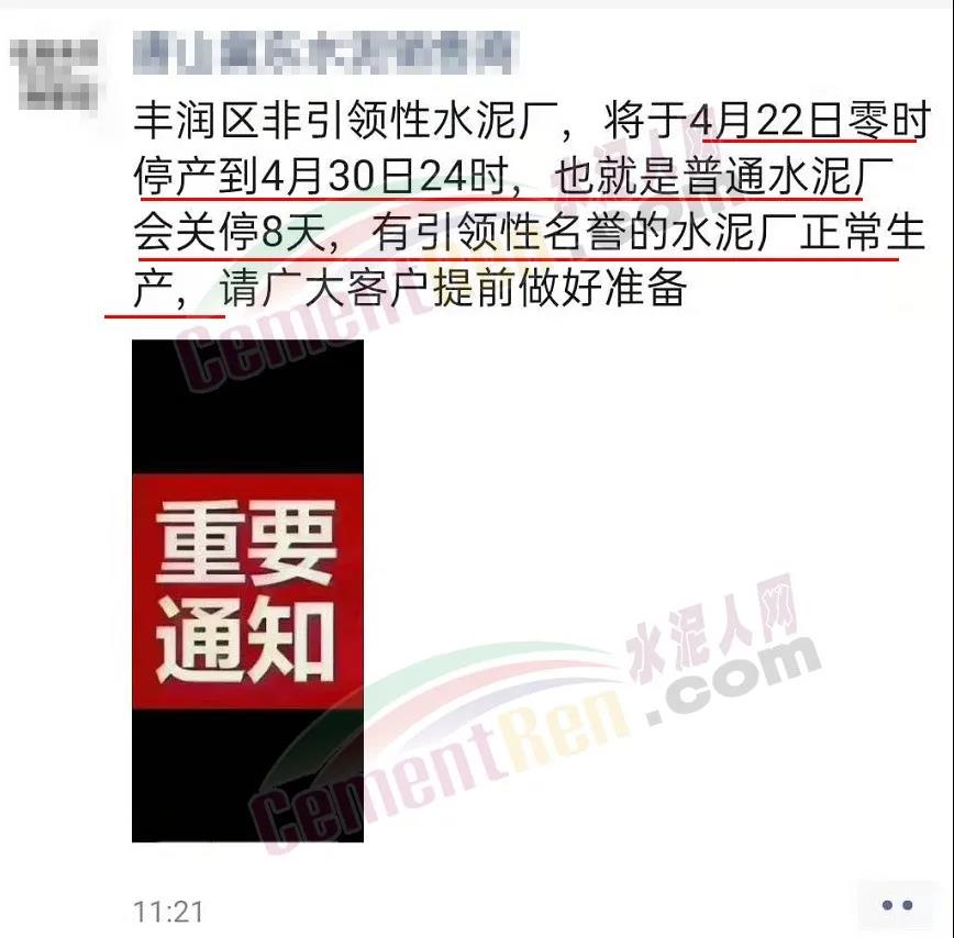 水泥人网通讯员消息:日前,河北唐山丰润区水泥经销商通知,“丰润区非引领性水泥厂,将于4月22日零时停产到4月30日24时,也就是普通水泥厂会关停8天,有引领性名誉的水泥厂正常生产”。同时,区域内部分企业已经率先通知上调水泥价格。