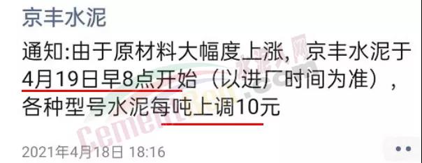 京丰水泥通知由于原材料大幅度上涨,京丰水泥于4月19日早8时上调各型号水泥价格10元/吨。