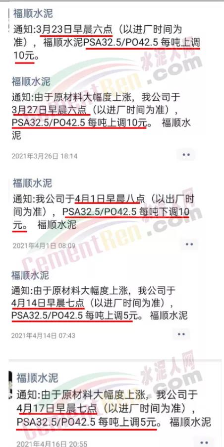 福顺水泥通知:由于原材料大幅度上涨,公司于4月17日早七点,PSA32.5/PO42.5上调5元/吨。据水泥人网了解,自3月下旬开始福顺水泥已多次上调水泥价格,累计上调40元/吨。
