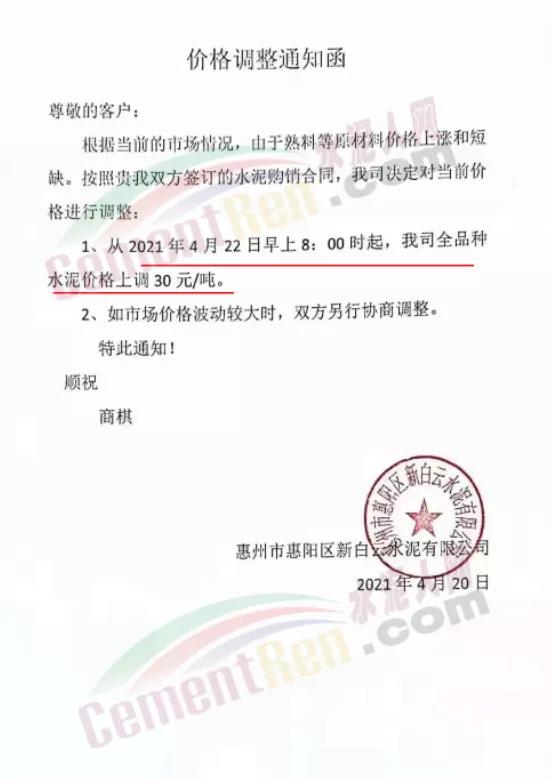 近期珠三角区域再次迎来全品种水泥价格上调30元/吨,惠州市惠阳区新白云水泥有限公司通知根据当前的市场情况,由于熟料等原材料价格上涨和短缺。公司决定从4月22日早上8时起,全品种水泥价格上调30元/吨。