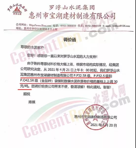 罗浮山水泥集团惠州市宝湖建材制造有限公司通知,由于熟料等原材料价格大幅上涨,根据市场的实际情况,经集团公司研究决定,从4月21日上午8时起,罗浮山水泥集团惠州市宝湖建材制造有限公司P.P32.5R级、P.P32.5级和P.O42.5R级(全品种)袋装和散装水泥在原有价格基础上上调30元/吨。