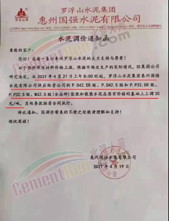 罗浮山水泥集团惠州国强水泥有限公司通知由于熟料等原材料价格上涨,根据市场及生产的实际情况,经集团公司研究决定,从4月21日上午8时起,罗浮山水泥集团惠州国强水泥有限公司P.O42.5R级、P.O42.5级和P.P32.5R级、P.P32.5级、M32.5级(全品种)袋装和散装水泥在原有价格的基础上上调30元/吨。