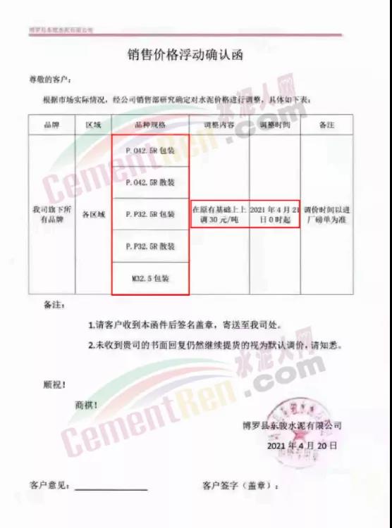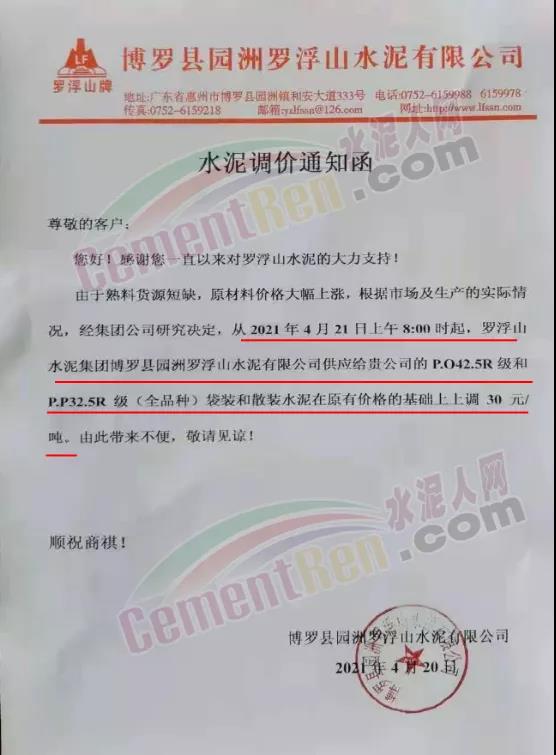 博罗县园洲罗浮山水泥有限公司罗浮山牌通知由于熟料货源短缺,原材料价格大幅上涨,根据市场及生产的实际情况,经集团公司研究决定,从4月21日上午8时起,公司P.O42.5R级和P.P32.5R级(全品种)袋装和散装水泥在原有价格的基础上上调30元/吨。
