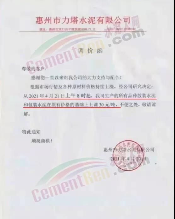 惠州市力塔水泥有限公司通知根据市场行情及各种原材料价格持续上涨,经公司研究决定从4月21日上午8时起,公司生产的所有品种散装水泥和包装水泥在原有价格的基础上上调30元/吨。