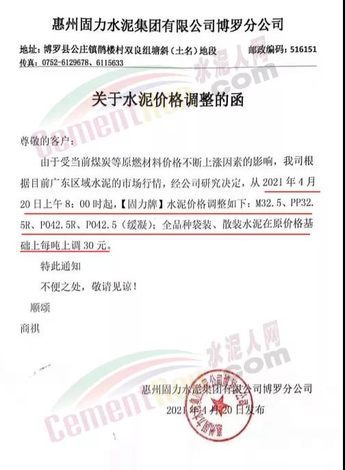 惠州固力水泥集团有限公司通知,由于受当前煤炭等原燃材料价格不断上涨因素的影响,经公司研究决定,从4月20日上午8时起,“固力牌”水泥M32.5、PP32.5R、PO42.5R、PO42.5(缓凝),全品种袋装、散装水泥在原价格基础上每吨上调30元。