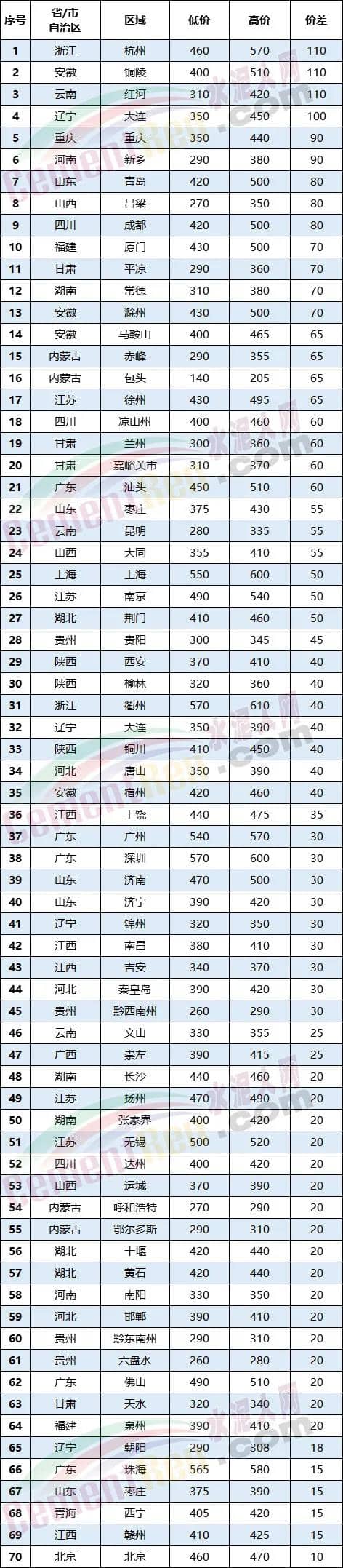 受两大核心区域涨价辐射影响,相邻区域纷纷发函上调水泥熟料价格。在一片涨价声中,有一些不和谐的声音。因部分企业未落实涨价,令区域内出现不小的价格差。从水泥人网信息中心重点监控的70个地区来看,价差最高的区域为浙江杭州、安徽铜陵、云南红河、辽宁大连等区域,价差在100元/吨左右,最高价差在110元/吨左右。
