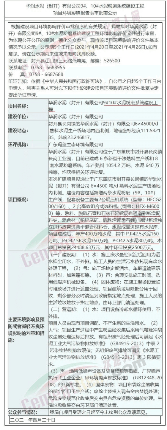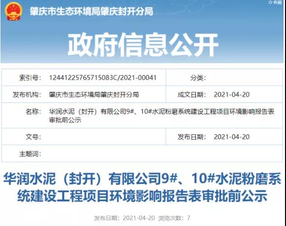 4月20日,广东省肇庆市生态环境局肇庆封开分局发布《华润水泥(封开)有限公司9#、10#水泥粉磨系统建设工程项目环境影响报告表审批前公示》提到华润水泥(封开)有限公司次将新建两条水泥粉磨(9#、10#)生产线。