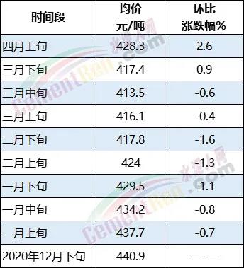 以PO42.5散装水泥为例,国家统计局数据显示:2020年末PO42.5散装水泥均价为440.9元/吨,一月上旬出现小幅下跌至437.7元/吨,四月上旬均价为428.3元/吨,四月上旬环比一月上旬报价降幅为2.15%。三月下旬到四月上旬涨幅为2.6%。