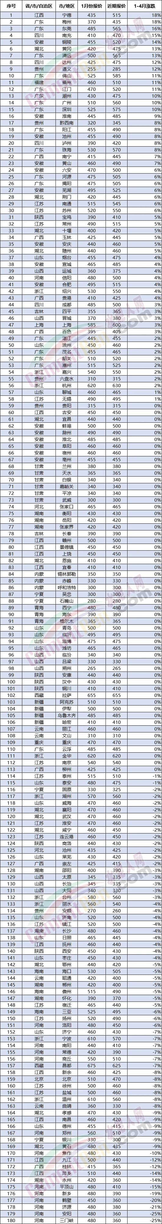 从水泥人网信息中心监控数据可见,三十一个省市自治区年初至今绝大多数区域水泥价格处于下跌或持平,180个区域中有58个地区有1%~18%的涨幅,涨幅18%的区域为江西宁德和广东梅州地区。67个区域下跌1%~25%,下跌25%的为河南三门峡和安阳地区。综合来看,有将近70%的区域水泥价格出现波动,30%的区域水泥价格与1月份报价持平。价格波动的区域中有一半以上的企业目前报价较1月份下跌。