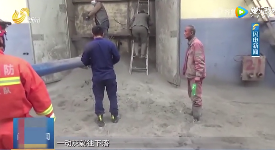 4月21日在山东菏泽市鄄城县一名工人在工作时,不慎坠入水泥库,腰部以下陷在水泥灰中,附近水泥灰堆垛,高达4米,工人越陷越深,随时有坍塌的危险,情况十分紧急。