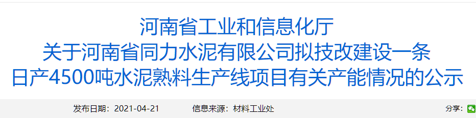 2021年3月9日、4月13日,鹤壁市工业和信息化局分别向我厅报送了《鹤壁市工业和信息化局关于河南省同力水泥有限公司4500t/d新型干法熟料生产线技术改造工程请示》(鹤工信文〔2021〕6号)和《鹤壁市工业和信息化局关于河南省同力水泥有限公司日产4500吨新型干法水泥熟料生产线技术改造工程公示公告的报告》(鹤工信函〔2021〕1号)文件。