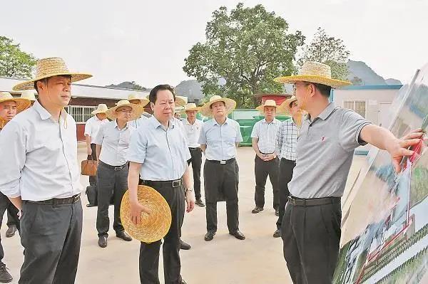 4月22日,自治区人大常委会副主任、市委书记刘有明(前左二)在崇左南方水泥二期项目现场查看项目规划设计图,了解项目进展情况。