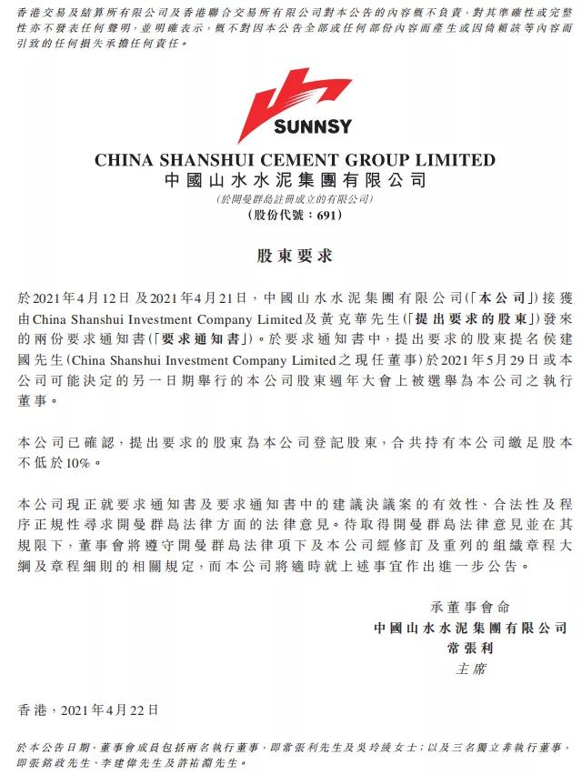 日前,山水水泥发布公告,于2021年4月12日及2021年4月21日,公司接获由China Shanshui Investment Company Limited及黄克华发来的两份要求通知书。于要求通知书中,提出要求的股东提名侯建国于2021年5月29日或公司可能决定的另一日期举行的公司股东周年大会上被选举为公司的执行董事。