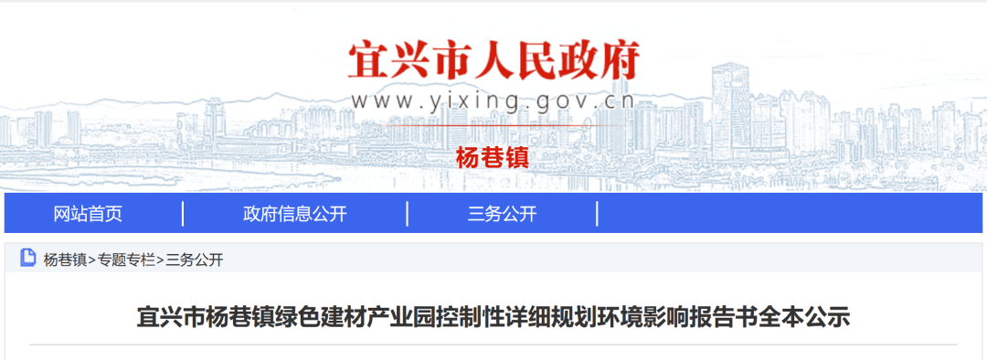 日前,江苏宜兴市人民政府网站发布《宜兴市杨巷镇绿色建材产业园控制性详细规划环境影响报告书》(以下简称报告书)。