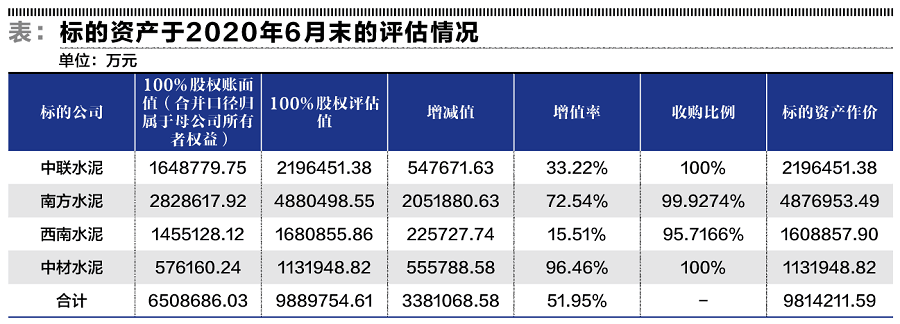 而中联水泥等四家公司的估值取决于经国资委备案的沃克森国际资产评估公司出具的第三方资产评估报告。以2020年6月30日为基准日,沃克森采纳的对标公司包括海螺水泥、天山股份、祁连山和上峰水泥等可比企业,以6.03-7.84倍市盈率取值作为基础,经25%不可流通折扣率等调整后,运用市场法得出的最终评估结果是:中联水泥的股权价值为219.6亿元、南方水泥的股权估值为488亿元、西南水泥的股权估值为168.1亿元、中材水泥的股权益估值为113.2亿元。
