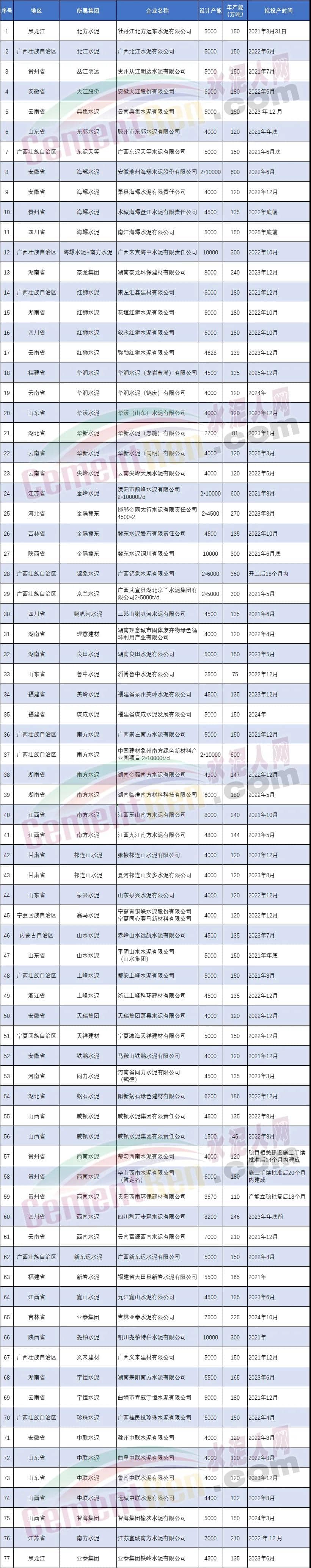 中国建材集团南方水泥、西南水泥、中联水泥、北方水泥、祁连山、赛马水泥等多家企业目前在建拟建生产线共22条熟料生产线,合计产能达3539万吨。