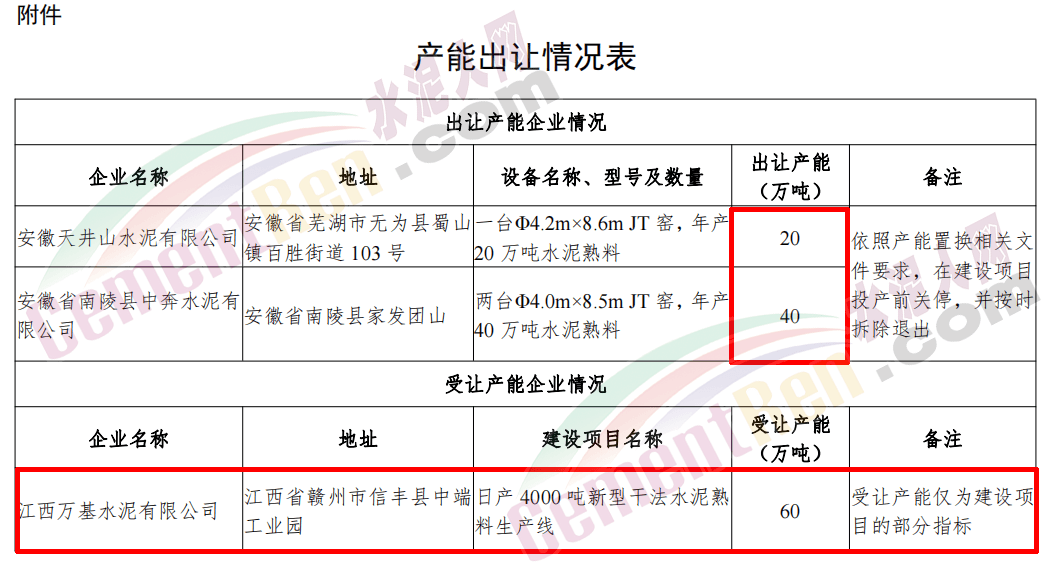 据水泥人网了解,2019年1月30日安徽省工信厅曾发布安徽天井山水泥有限公司和安徽省南陵县中奔水泥有限公司水泥熟料生产线产能出让的公告。产能出让情况表显示,安徽天井山水泥一条水泥熟料生产线和安徽南陵县中奔水泥两条水泥熟料生产线产能退出产能为三台JT窑年产能合计60万吨。用于江西万基水泥有限公司建设一条4000t/d水泥熟料生产线。