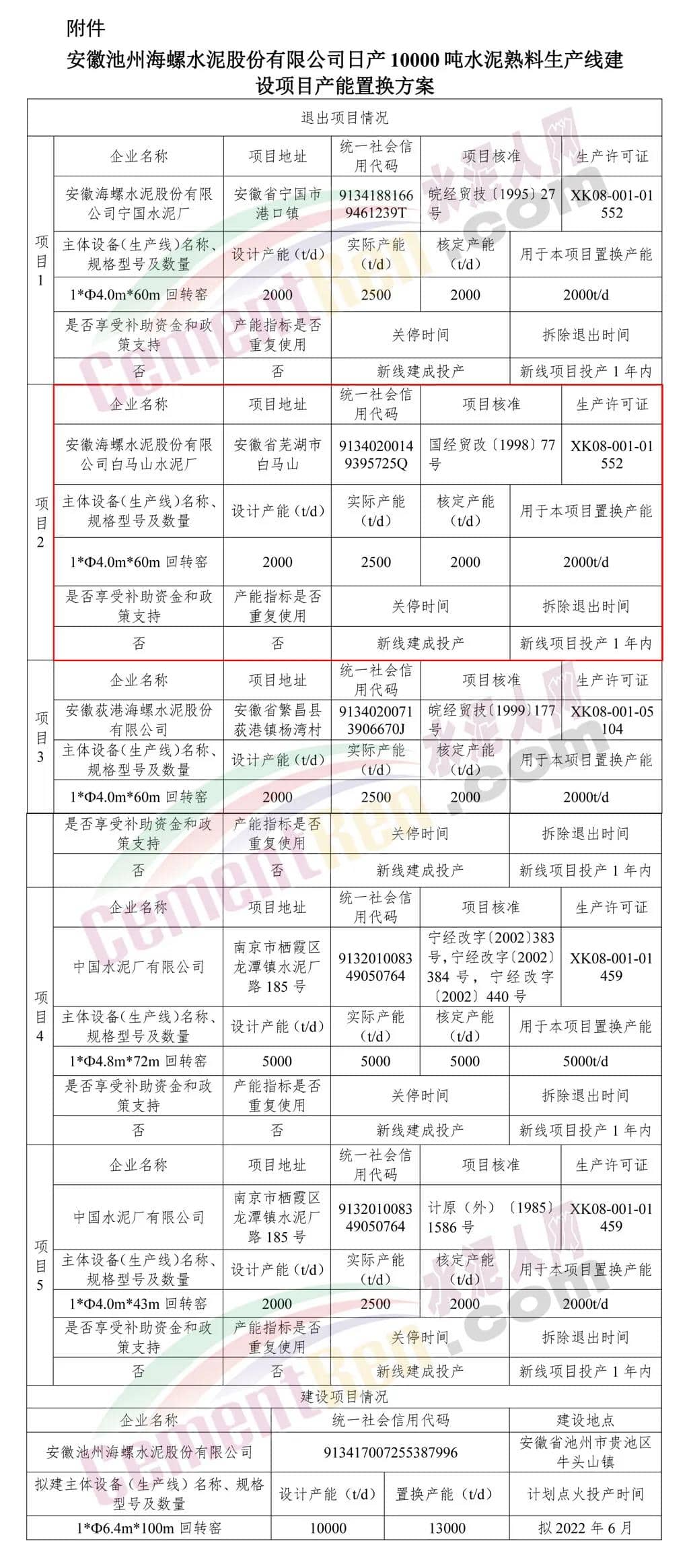2020年7月,安徽省工信厅发布的一则产能置换方案中提到海螺水泥将通过退出包括安徽省芜湖市的海螺水泥白马山水泥厂2000t/d熟料生产线在内的5个项目,用于在池州市境内新建一条10000t/d熟料生产线。退出项目将在新线建成投产前关停,并于新线项目投产1年内拆除。