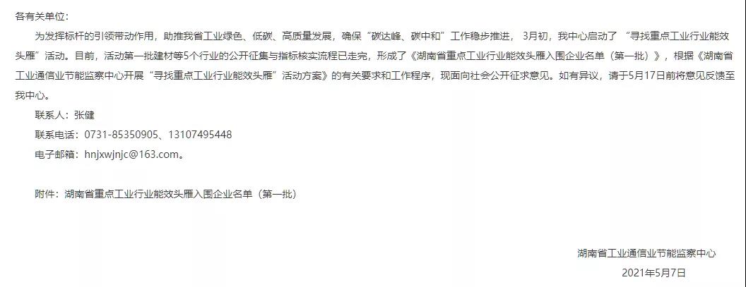 据了解,今年3月初,3月3日,湖南省工业通信业节能监察中心发出通知,决定组织开展“寻找重点工业行业能效头雁”活动。活动甄选发布一批单位产品(或工序)能耗最低的生产企业名单及其能耗指标,强化企业节能经验推广,发挥标杆引领带动作用,促进全省工业企业能源管理水平和能源利用效率的全面提升。