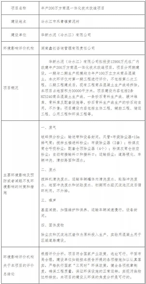 近日,华新水泥(冷水江)有限公司年产200万方商混一体化技术改造项目境影响报告表拟审批公示。从公示得知,华新水泥(冷水江)有限公司拟投资12900万元在厂内改建年产200万方商混一体化技术改造项目,项目分两期建设,一期与二期生产规模均为年产100万立方米商品混凝土,本次环评仅对第一期工程进行评价,不包括第二次工程。
