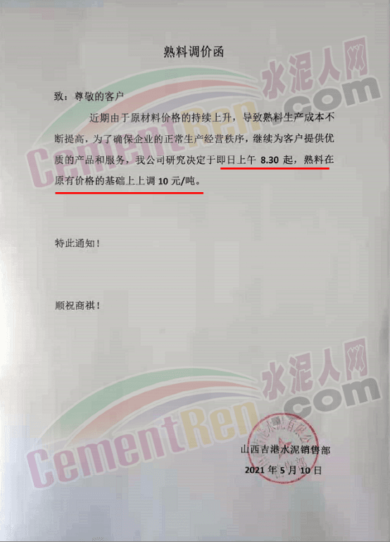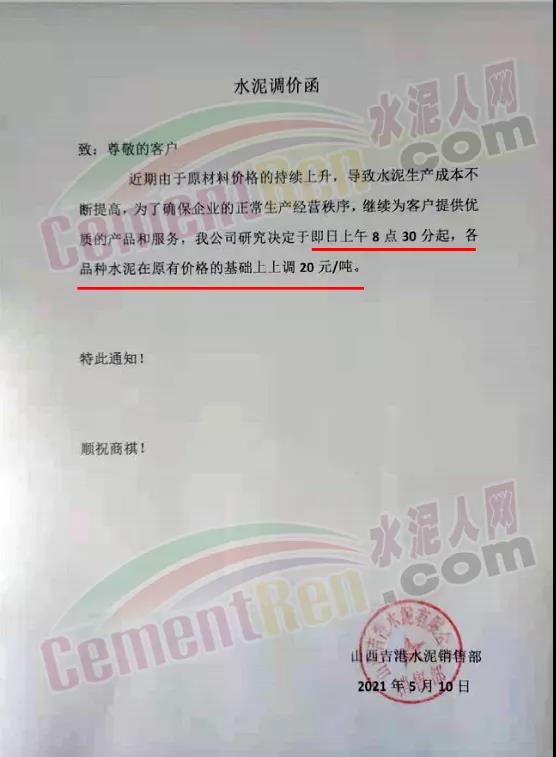 水泥人网通讯员消息,近几日华北地区多家企业通知上调水泥价格,5月10日山西吉港水泥连发两份调价函通知水泥涨20元/吨,熟料涨10元/吨。