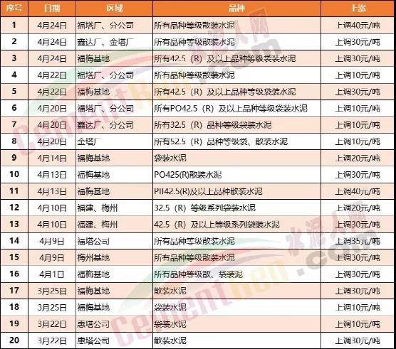 四月初福建三明、南平、龙岩、宁德、南平、泉州、厦门、漳州、莆田、闽南、龙岩等地区塔牌水泥、台泥水泥、华润水泥、红狮水泥、福建春驰等陆续通知上调30-55元/吨。同时外发广东区域的水泥价格随广东区域价格上调而上涨。