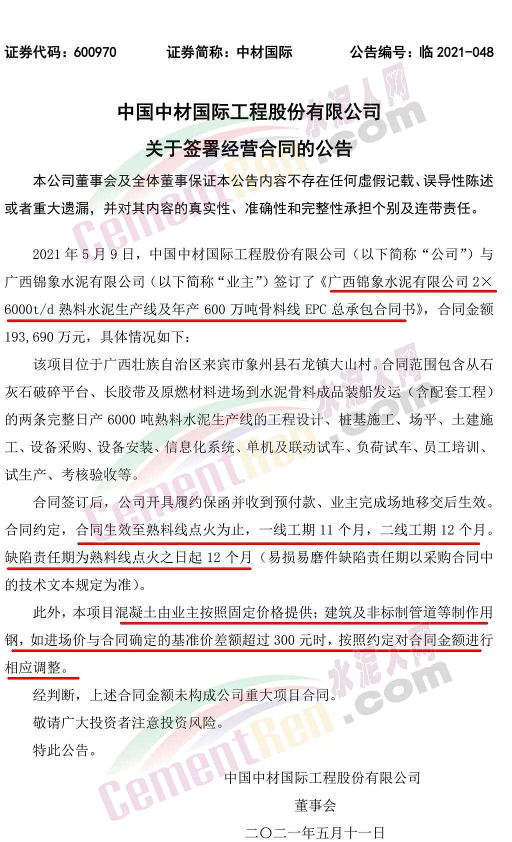 中材国际5月10日晚间公告称,2021年5月9日,中国中材国际工程股份有限公司与广西锦象水泥有限公司签订了《广西锦象水泥有限公司2×6000t/d熟料水泥生产线及年产600万吨骨料线EPC总承包合同书》,合同金额193,690万元。