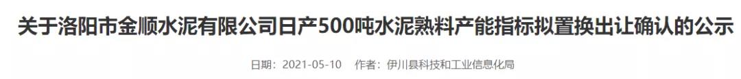 日前,河南省洛阳市伊川县人民政府发布《关于洛阳市金顺水泥有限公司日产500吨水泥熟料产能指标拟置换出让确认的公示》称,根据相关文件规定,现将关闭出让的确认产能有关情况进行公示,具体公示如下: