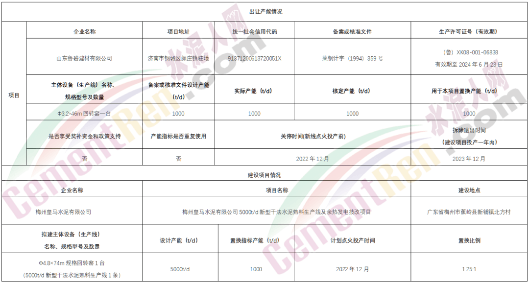 据水泥人网此前报道,山东省济南市山东鲁碧建材有限公司拟将该公司位于济南市钢城区的一条1000t/d水泥熟料生产线的产能转让给省外企业梅州皇马水泥有限公司。用于在广东省梅州市蕉岭县新铺镇北方村新建一条5000t/d新型干法水泥熟料生产线。 新建生产线或将于2022年12月点火投产。