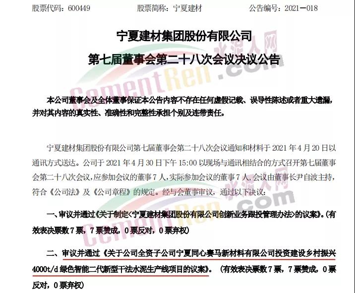 宁夏建材近日公布公司第七届董事会第二十八次会议决议,审议并通过关于公司全资子公司宁夏同心赛马新材料有限公司投资建设乡村振兴4000t/d绿色智能二代新型干法水泥生产线项目的议案。