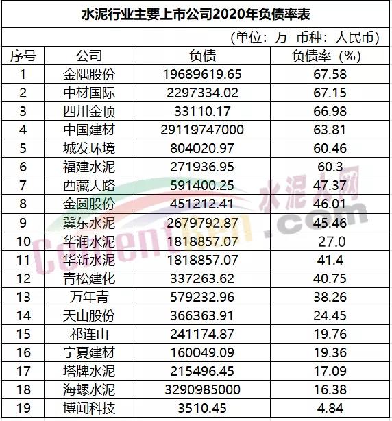负债率均低于70%,水泥行业运行平稳