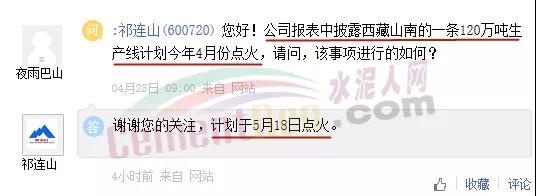 祁连山水泥5月12日在投资者互动平台回复称:谢谢您的关注,计划于5月18日点火。