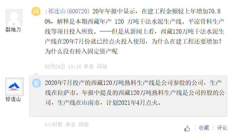 上市公司祁连山(600720)回复称,2020年7月投产的西藏120万吨熟料生产线是公司参股的公司,生产线在拉萨市。年报中提及的西藏120万吨熟料生产线是公司控股的公司,生产线在山南市,计划2021年4月点火。