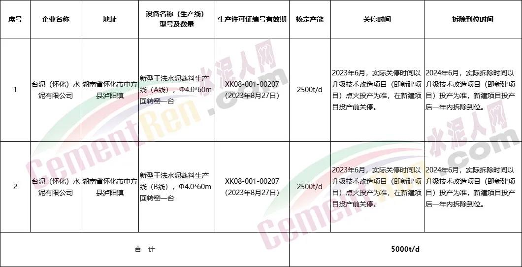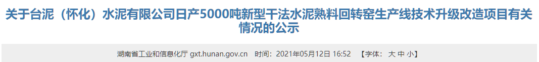 5月12日湖南省工信厅发布《关于台泥(怀化)水泥有限公司日产5000吨新型干法水泥熟料回转窑生产线技术升级改造项目有关情况的公示》称,台泥(怀化)水泥有限公司拟在原厂区内实施智能化升级技术改造“合二为一”,建设一条日产5000吨新型干法水泥熟料回转窑生产线,并将于2023年6月投产。
