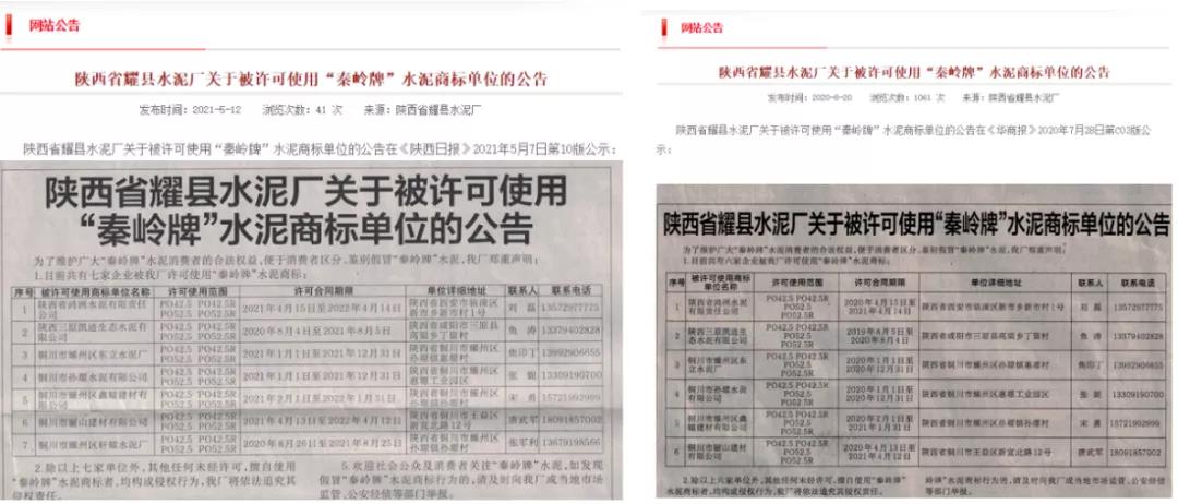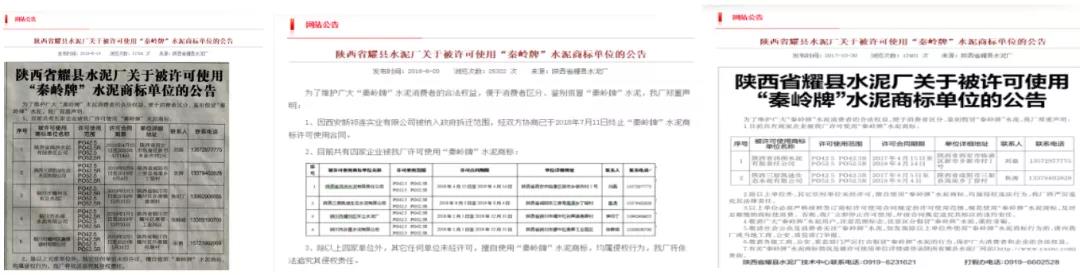 同时,提请广大“秦岭牌”水泥用户注意授权范围,注意区分假冒“秦岭牌”水泥,谨防受骗。欢迎社会公众及消费者关注“秦岭牌”水泥,如发现假冒“秦岭牌”水泥商标行为的,请及时向耀县水泥厂或当地市场监管、公安经侦等部门举报。
